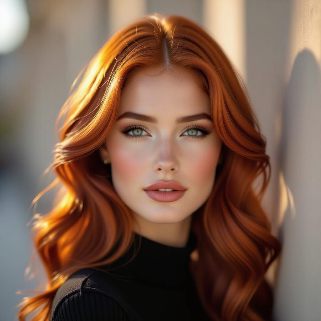 A captivating photograph in the style of Annie Leibovitz showcases a red haired young woman embodying sleek, fashion-inspired elegance, her long, wavy hair cascading around porcelain skin illuminated by warm, cinematic natural lighting.