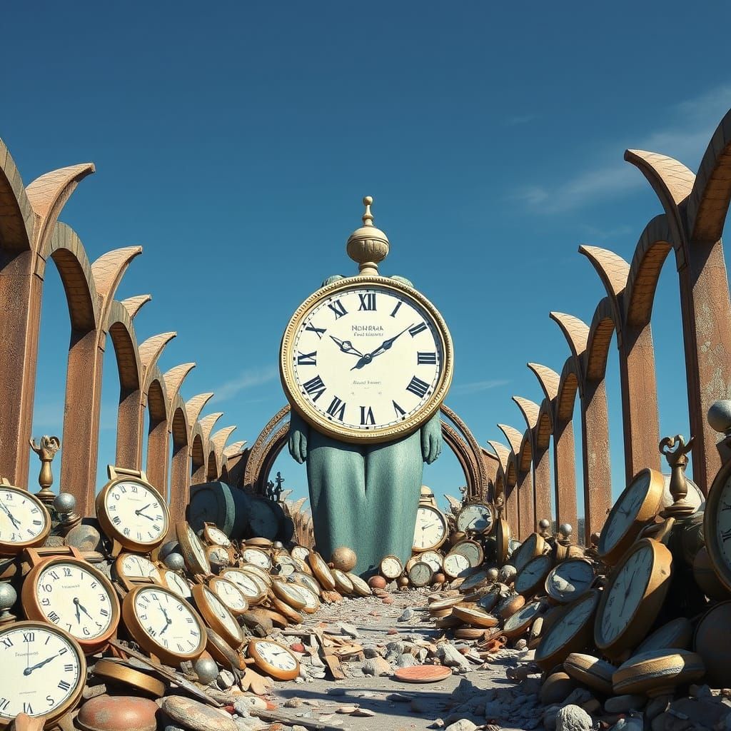 A surreal scene of a massive figure amidst a sea of clocks and bizarre objects. This image is reminiscent of a hyper surrealist painting, with a nod to masters of the surrealist art movement.