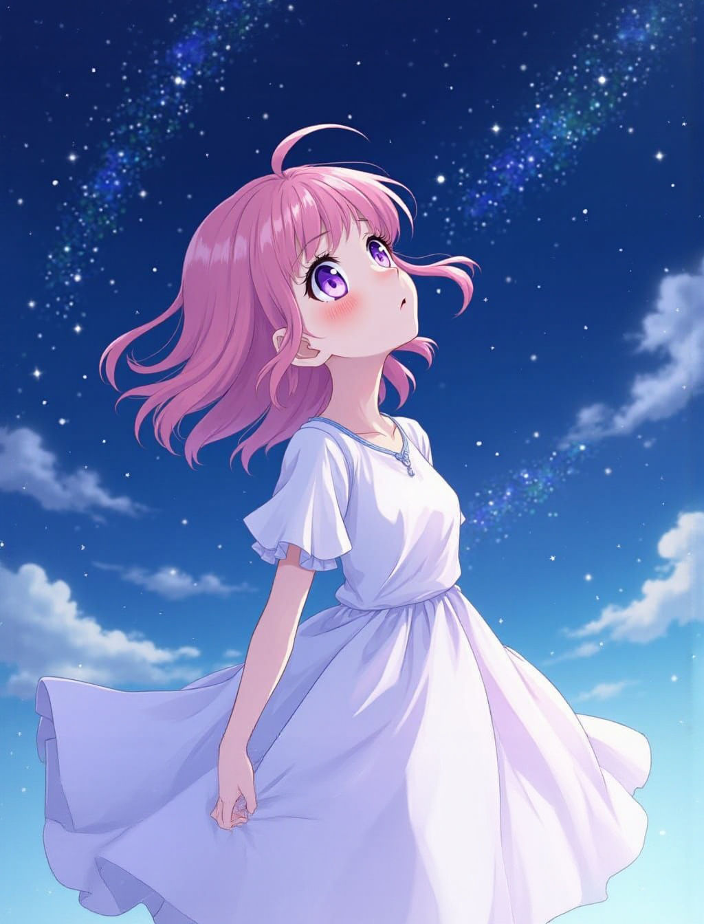 This anime-style image features a young woman with pink hair and purple eyes looking up in wonder at a vast, starry night sky. Rendered in a Japanese manga aesthetic.