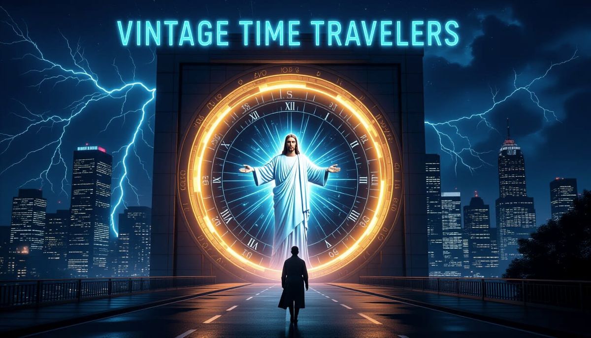 This image shows a dramatic 3D cinematic scene at night, where past, present, and future collide. A glowing portal emits a time machine into a modern city, rendered with hyper-detailed elements.