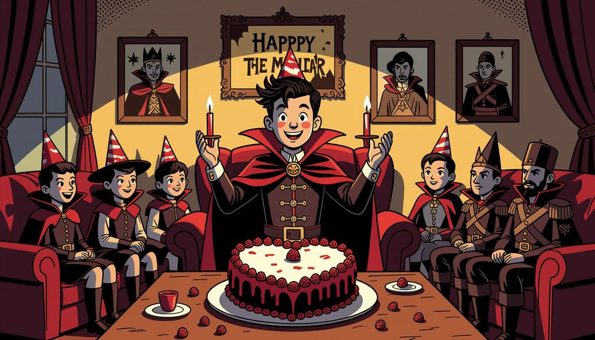 Graphic novel illustration of a 12-year-old boy celebrating his birthday on Halloween, dressed as Vlad "The Impaler" Dracul Tepes in a traditional Transylvanian costume. His living room walls are adorned with pictures of Dracula as a warrior prince and legend. He’s surrounded by friends wearing birthday hats, all dressed as vampires, vampire hunters, Romanian soldiers, and Ottoman soldiers. A giant heart-shaped chocolate raspberry birthday cake with a stake through it sits centrally. Dramatic lighting with deep shadows and vibrant pops of color reminiscent of the Shadow of the Bat graphic novel style, inspired by Ashley Wood and Katsuhiro Otomo.