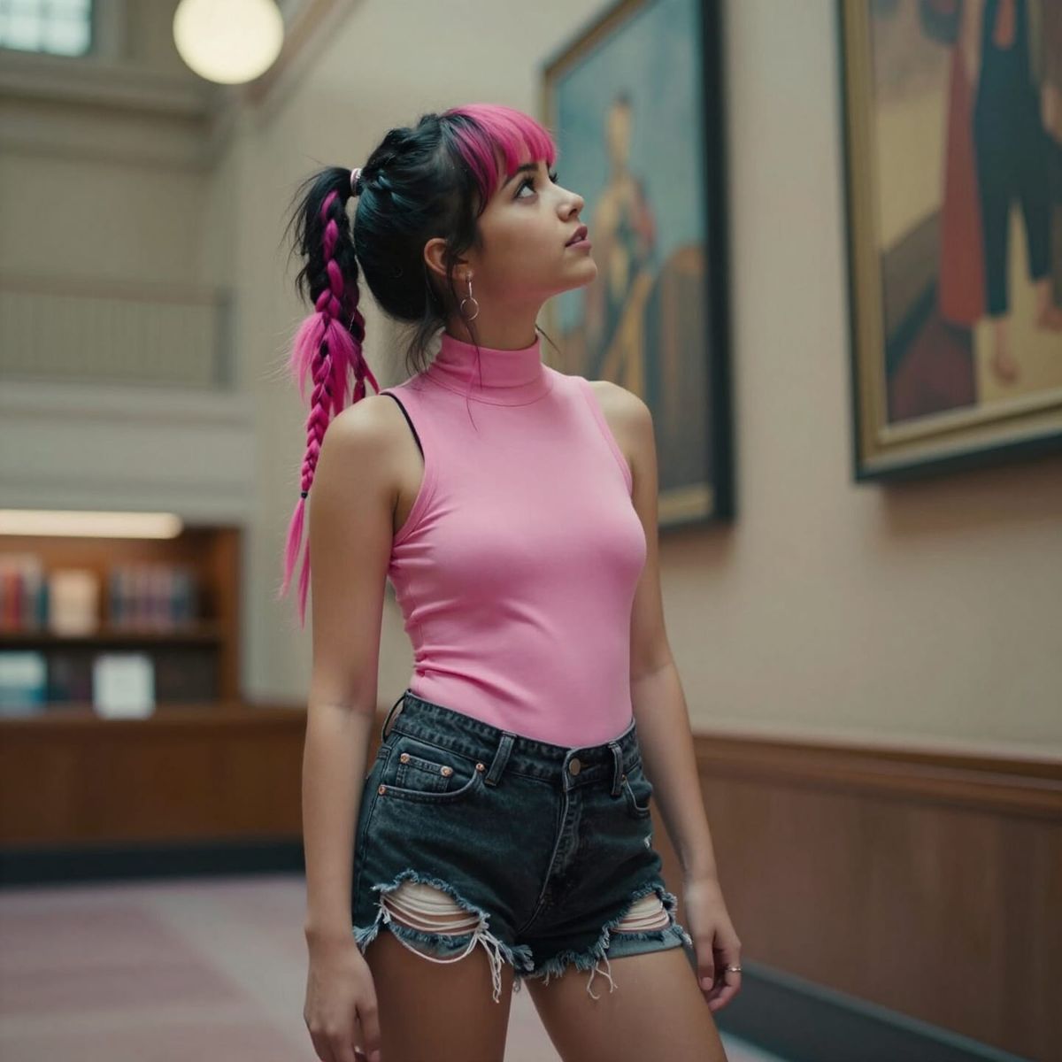 Cinematic film still of a punk girl with braided black and pink hair at the Los Angeles Central Library. Features dramatic lighting and a vibrant color palette.