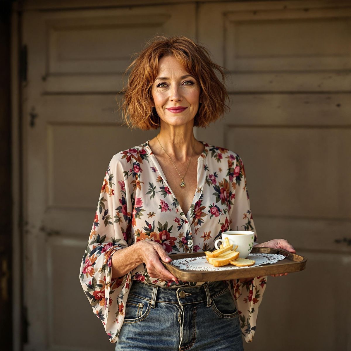 A serene, free-spirited woman enjoys a peaceful breakfast on her porch, surrounded by rustic charm and warm, golden light, exuding quiet confidence and subtle humor.
