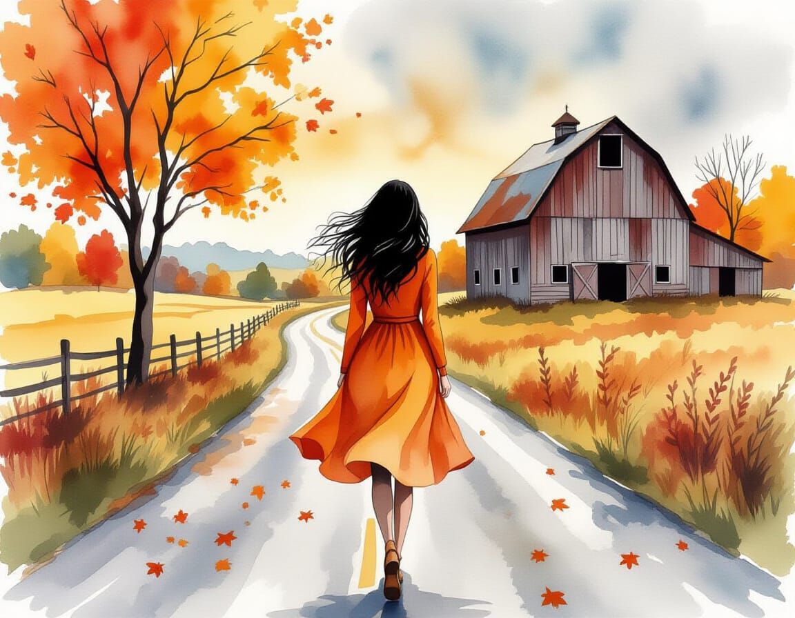 This image shows a woman with long black hair walking on a road near an abandoned barn in Vermont during fall. The wind is blowing, creating a sense of movement.