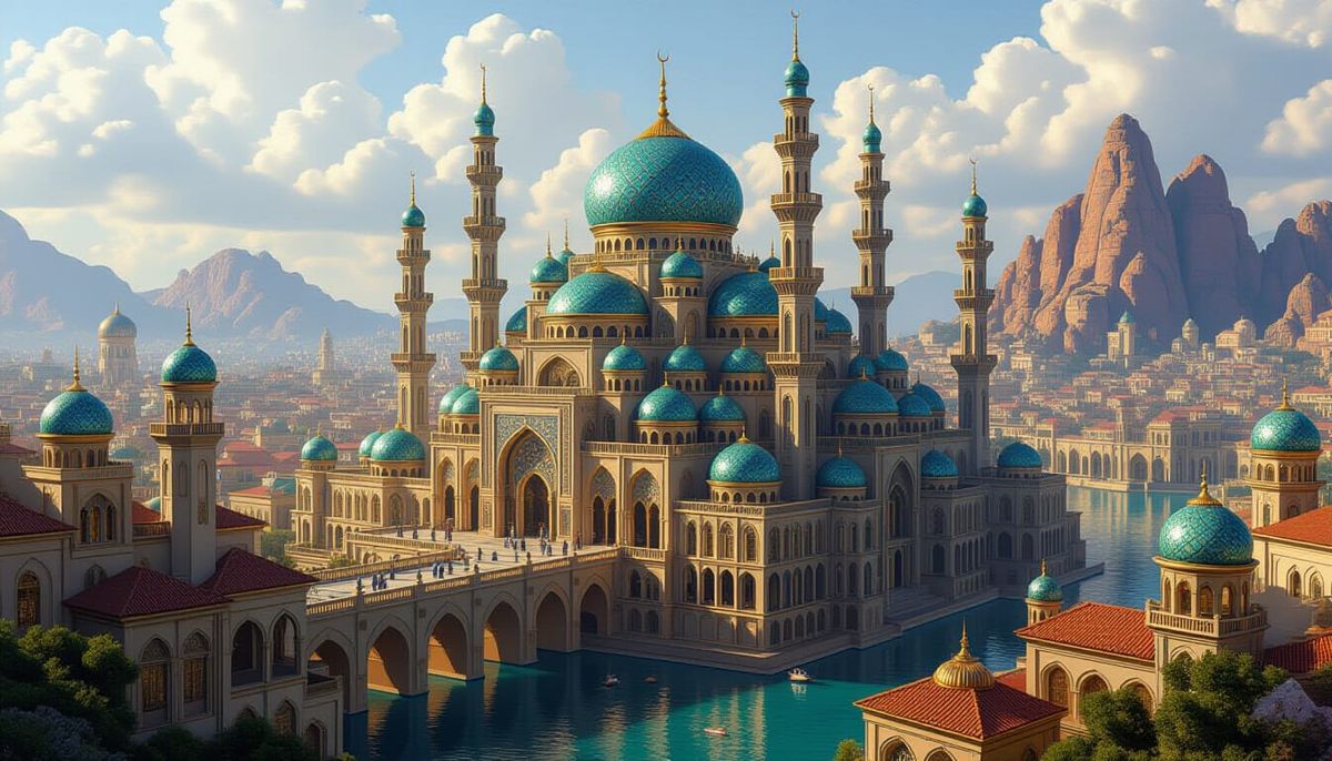 A photorealistic, hyperdetailed landscape showcasing a majestic djinn city with intricate Islamic architecture and silkpunk elements, featuring organic curves and dramatic lighting.