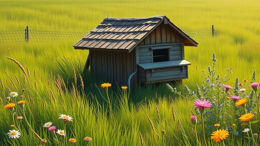 This image depicts a peaceful chicken coop set within a vibrant meadow blooming with wildflowers. Warm sunlight creates gentle shadows, rendered with realistic textures and earthy tones.