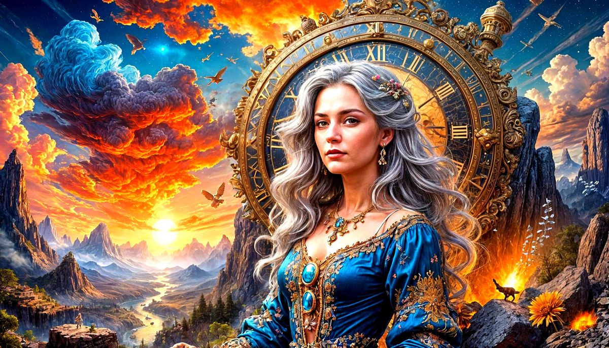 A striking picture of an elderly woman with silver hair observing a clock in the sky. The scene is rendered as a vibrant oil painting with glowing embers and swirling clouds.