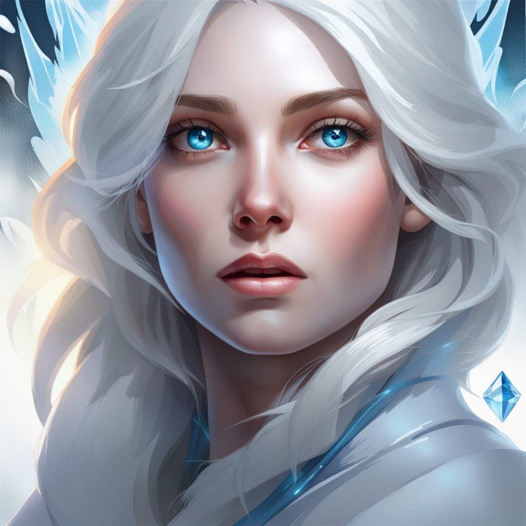 This image shows a head and shoulders portrait of a snow princess with white hair and blue eyes. The digital artwork features dynamic lighting, intricate details and triadic colors.