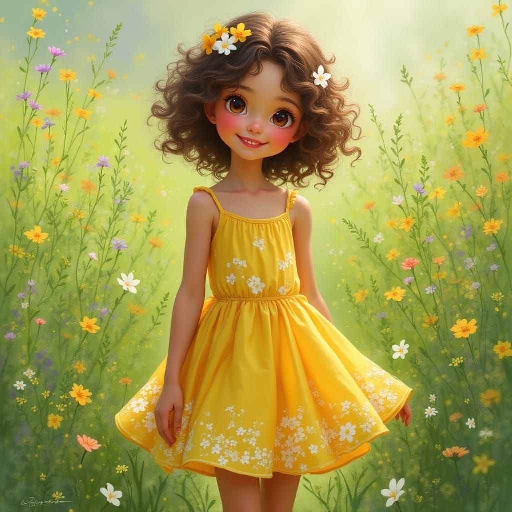 A sunlit meadow scene featuring a smiling girl in a yellow sundress. This image is rendered in an impressionistic style, reminiscent of classic paintings with soft textures and vibrant colors.