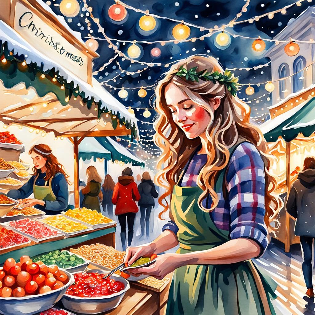 This image shows a vibrant Christmas fair scene filled with decorations, vendors, food, and people. Rendered with thick brushstrokes in a maximalist impressionist style, the soft, watercolor palette gives it a festive look.