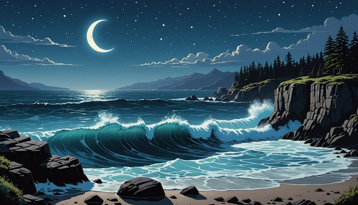 A stunning image of bioluminescent waves meeting a rocky shore under a starry sky and crescent moon. The scene captures a cinematic, photorealistic seascape with a touch of fantasy.