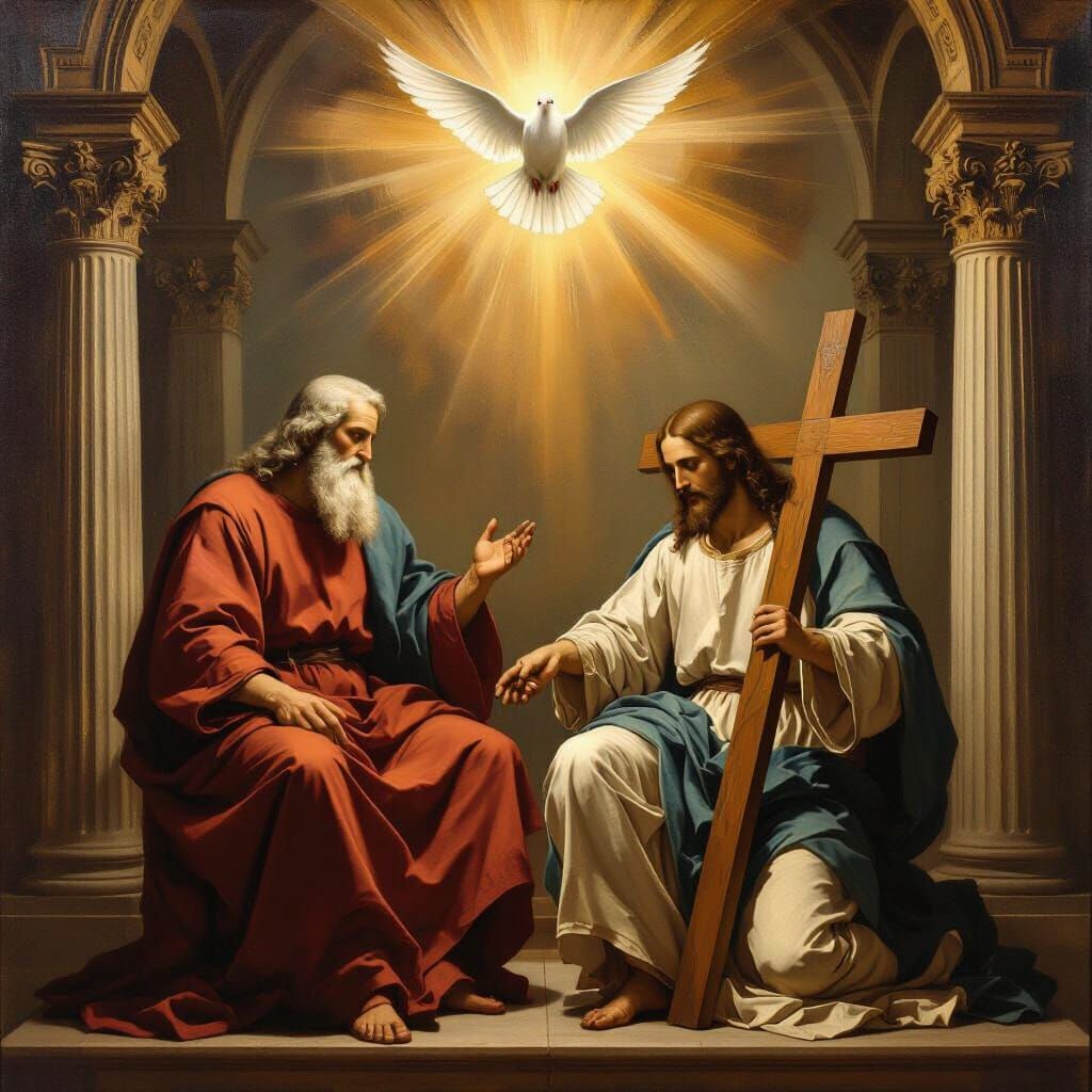 This image shows the Holy Trinity rendered in a Renaissance style. God the Father and Jesus Christ are seated, with the Holy Spirit depicted as a radiant dove, all set against classical architecture, painted with warm earthy tones.