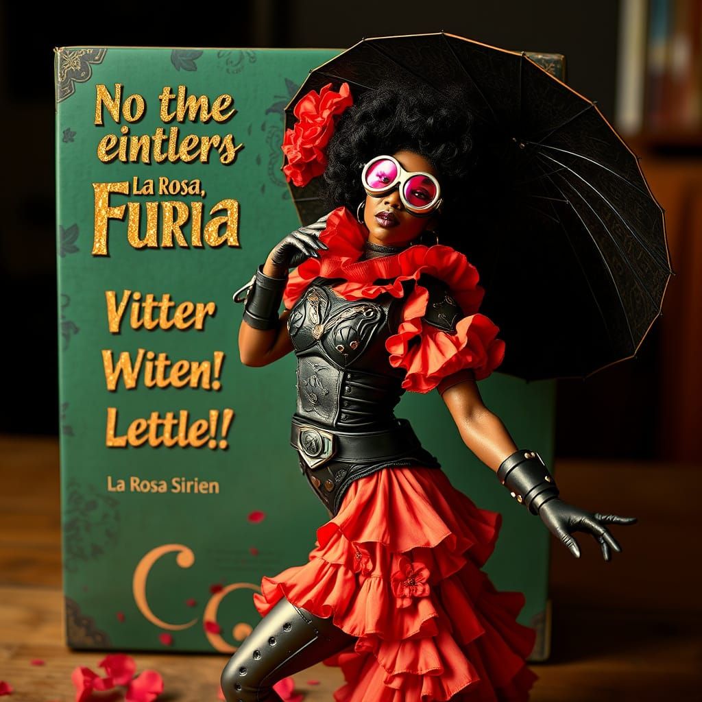 A flamenco-inspired steam siren with a dynamic pose, wearing boilerplate armor and holding a parasol that sprays red-hot cinders, embodying a fiery and flirtatious personality.