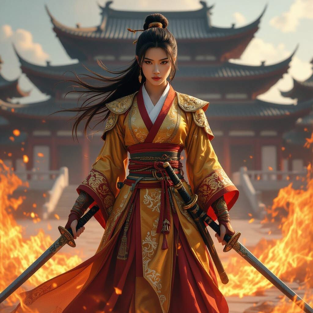 A striking picture of an Asian woman warrior in a red and gold robe, holding swords before a temple. Swirling flames and flowing hair accentuate her heroic pose in a cinematic style.