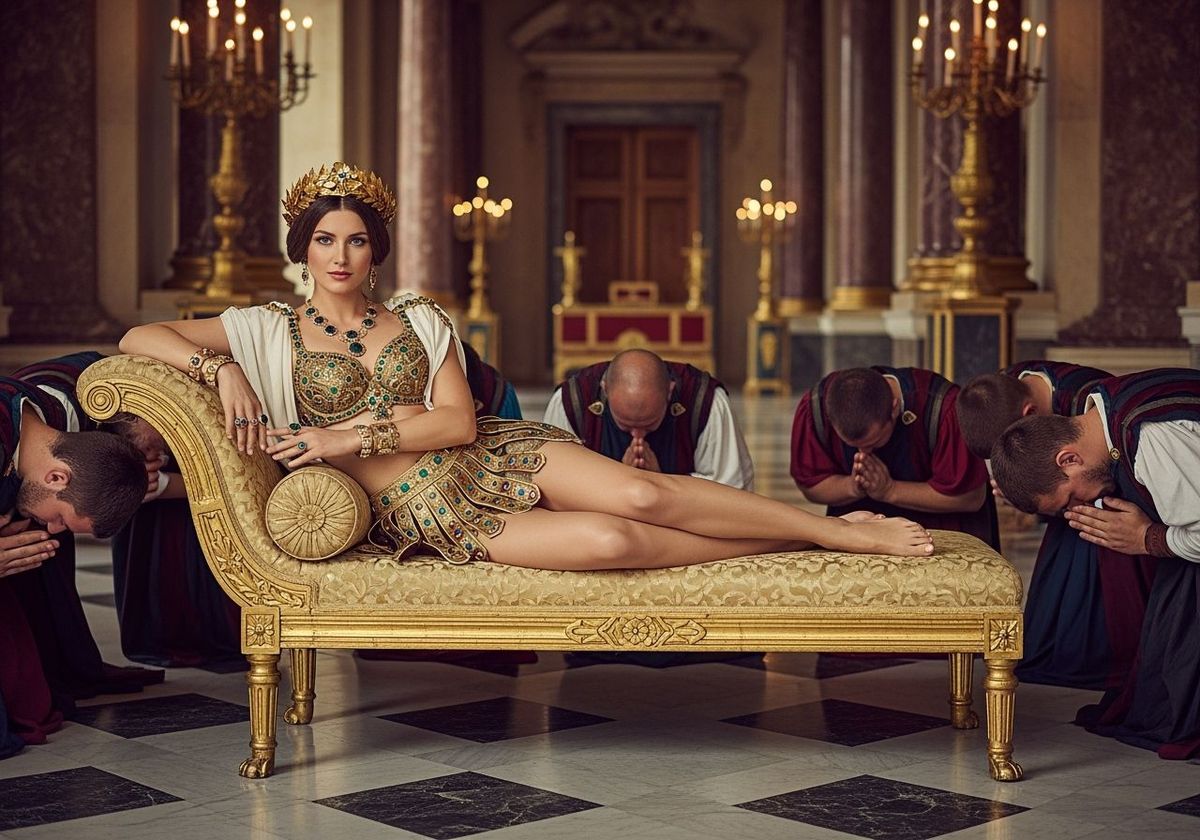 A captivating image of a Roman Empress relaxing on a golden chaise lounge. The scene features peasants bowing before her in a grand palace, captured with soft bokeh and natural lighting.