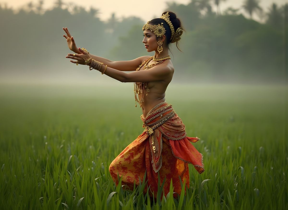 A serene Balinese dancer with intricate gold jewelry and a vibrant silk sarong, gracefully performing a traditional dance in a lush rice pad...