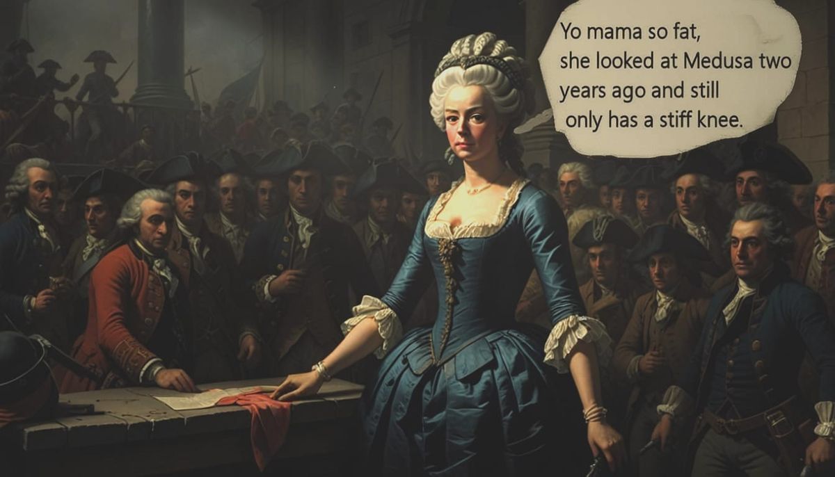 This image captures a dramatic, cinematic scene of Marie Antoinette facing her court with defiance. Shot with film grain and atmospheric lighting, it evokes a sense of historical grandeur.