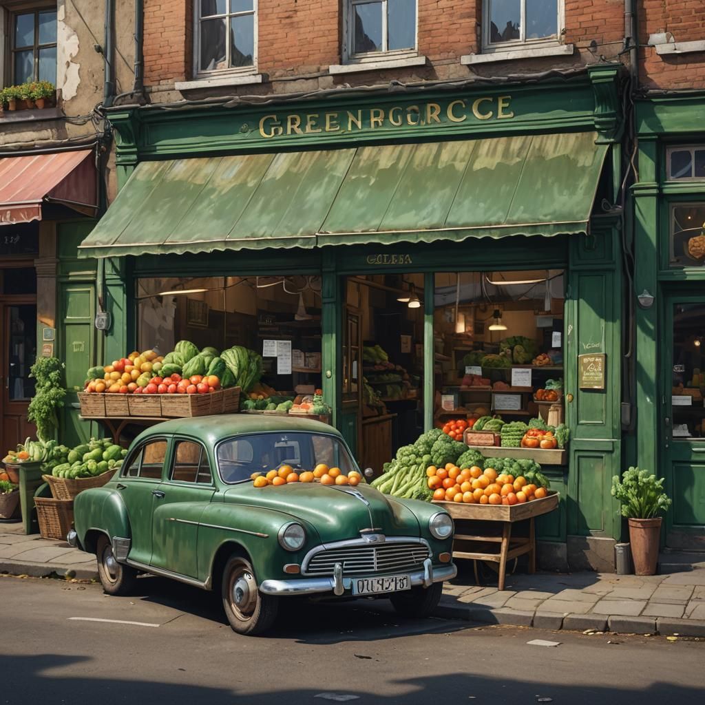 A hyperrealistic image showing a vintage car parked outside an old-fashioned greengrocer's shop. The concept art features a colorful background and intricate details with dramatic side lighting.