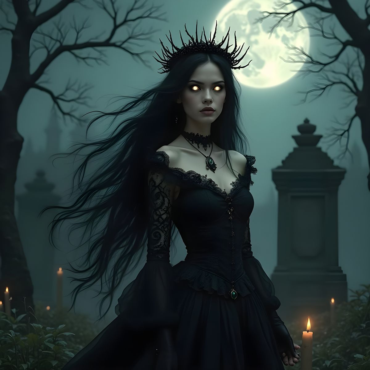 This image shows a sorceress with long black hair in a graveyard. She wears a crown and gown, summoning spirits under the moon in a gothic, romantic style with art nouveau details.