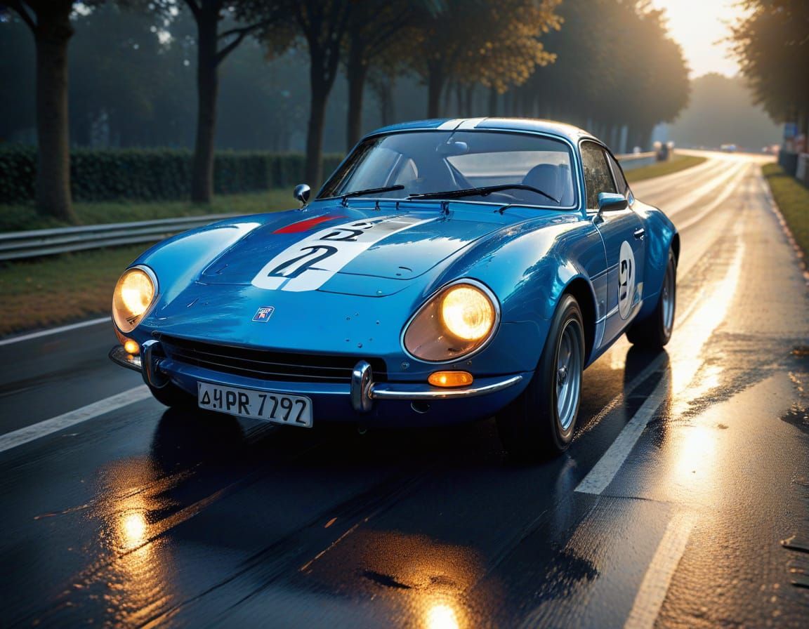 This dynamic comic book illustration captures a French blue 1972 Alpine A110 race car speeding down the Le Mans straightaway. Glistening wet pavement and early morning light add to the vibrant, smooth energy of the scene.