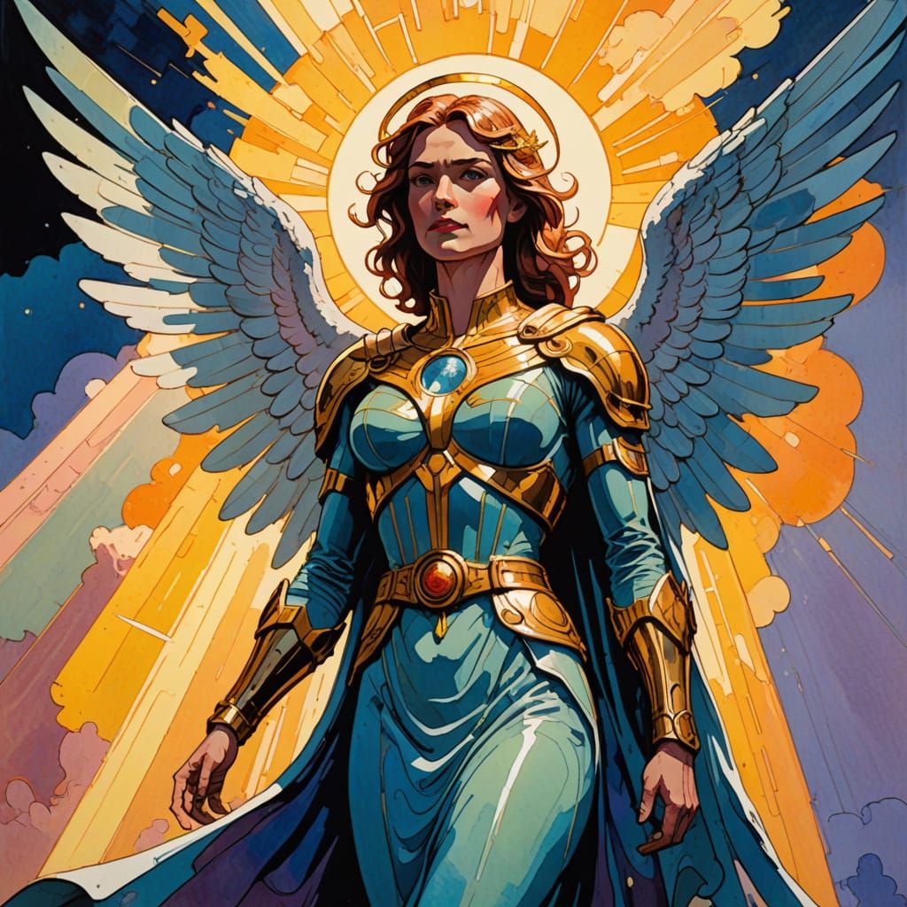 This image depicts a brightly lit archangel amidst sun rays, rendered in a retro comic book style with volumetric lighting and chiaroscuro.