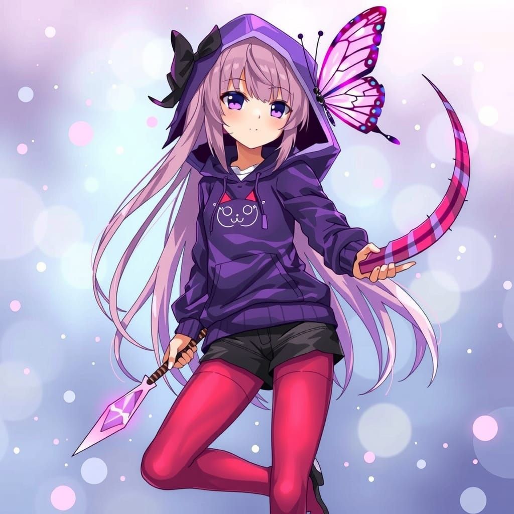 This image depicts an anime girl with vibrant, lilac and rose-colored hair, wearing a striking purple cat hoodie, in a dynamic pose, under the mystical influence of a majestic purple butterfly. The artwork combines elements of Takashi Murakami's colorful style, Hirohiko Araki's energetic poses, and Yoshi...