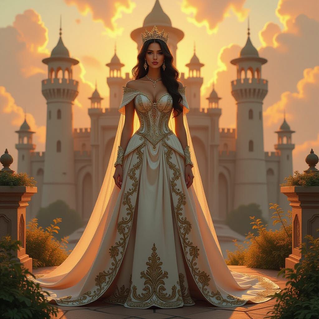 A regal queen in an ornate gown stands within the mystical Towers of The Fort of Care, bathed in warm golden light. The image evokes a whimsical, dreamy, and ethereal artistic style.