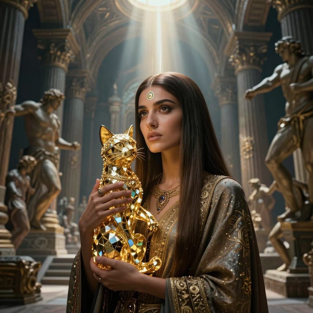 michelangelo painting style : beautiful soft armenian woman with ultra straight air holding gold crystal cat, she looks intrigued, very connected spiritual, ruins of shamballah in background, third eye chakra,, ray of lights between characters, ultra deep contrast, large scene composition, , ROMA, bad ...