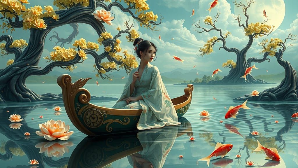 This image depicts a serene, young Asian woman guiding a delicate boat along a winding river, surrounded by a dreamlike landscape of twisted trees, floating flowers, and iridescent fish, evoking the surrealist style of Salvador Dalí's iconic masterpieces.