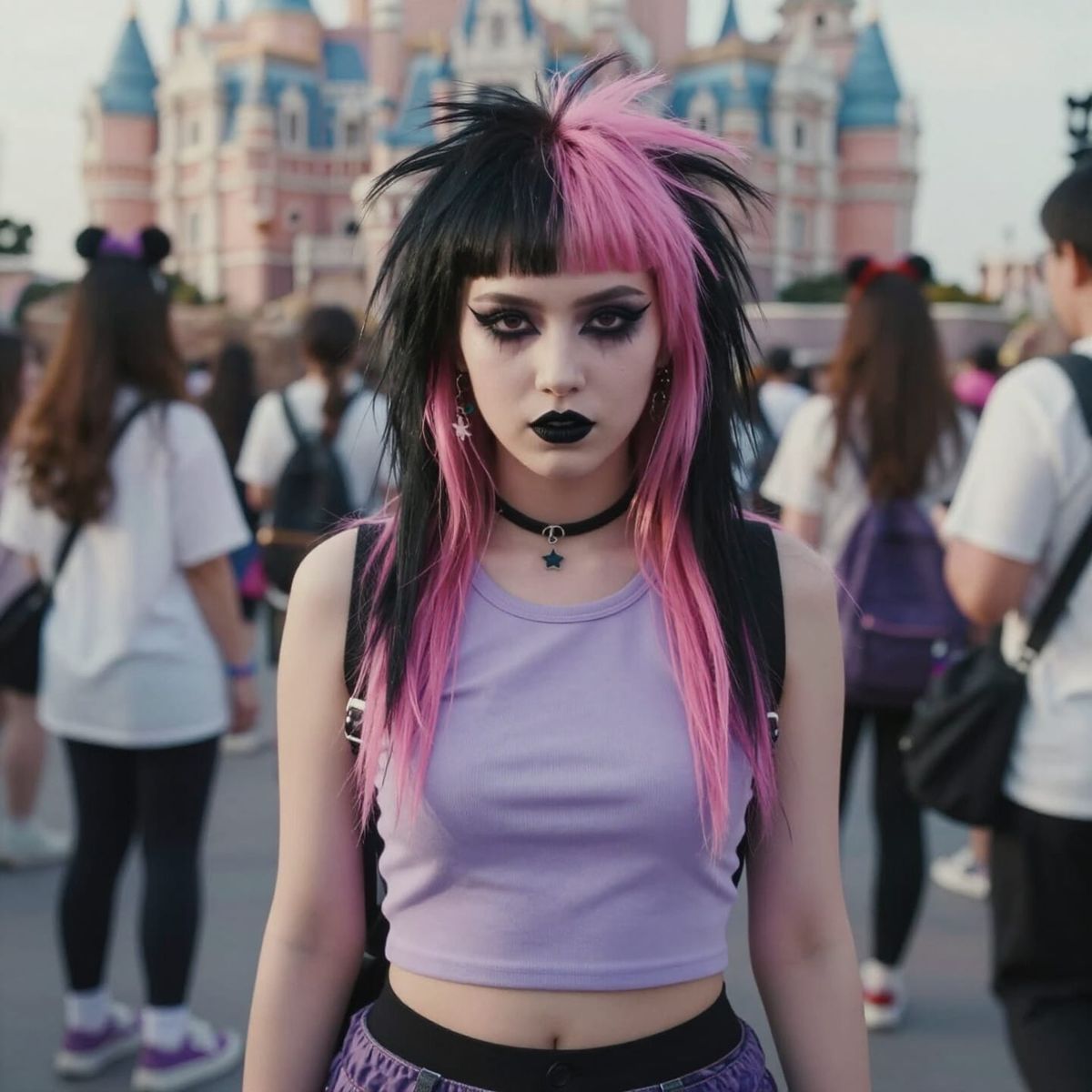 Easily generate your own punk girl images at Disneyland with our free AI tool. Get creative and make unique scenes!