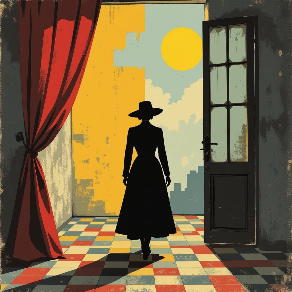 This image shows a lone figure in dark clothing, haunted by shadows in a claustrophobic space. Sunlight filters through torn curtains, creating a warm, hopeful atmosphere in a surreal collage style.