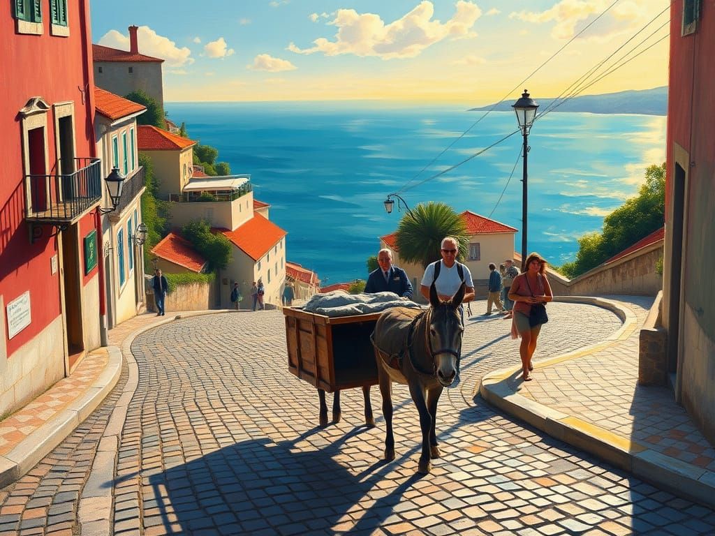 Portugal Noon Seascape Donkey Cart cobblestone winding road pedestrians Jazz Open Prompt