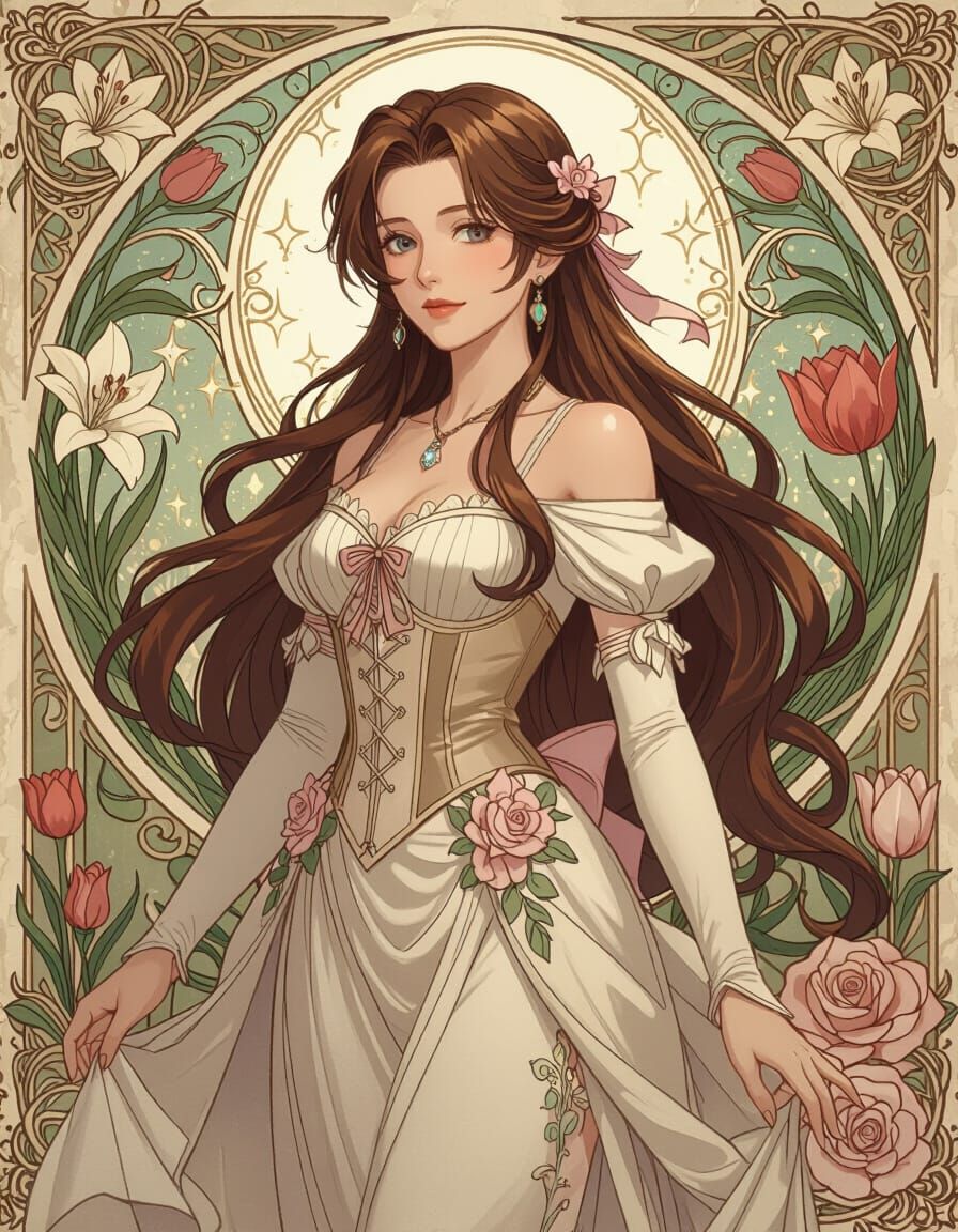 An Art Nouveau masterpiece of Aerith Gainsborough in a graceful pose, featuring flowing fabrics and intricate floral details. Rendered with soft brushstrokes in a vintage color palette.