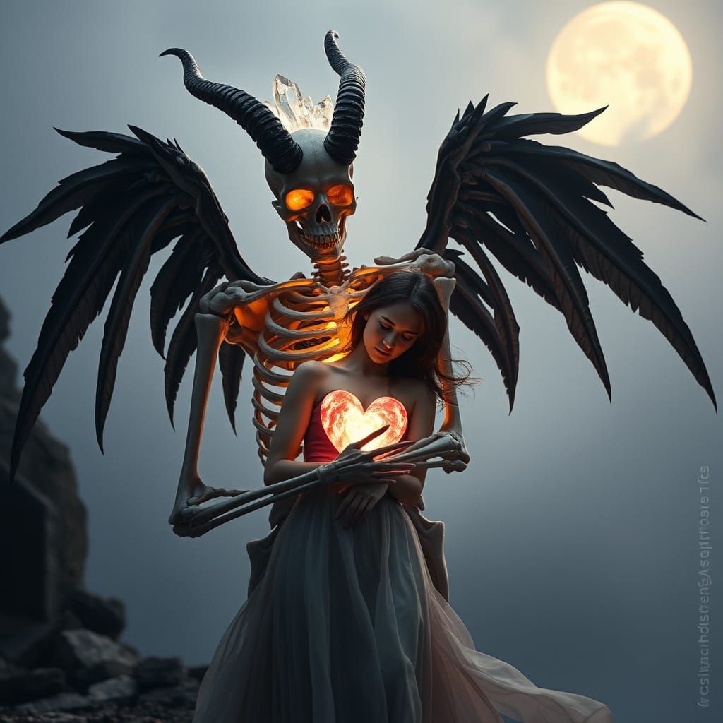A dramatic image of a skeletal figure tenderly embracing a woman. The figure has large horns and crystal shards, with ethereal wings and a crystallized heart, set within a surreal gothic landscape.