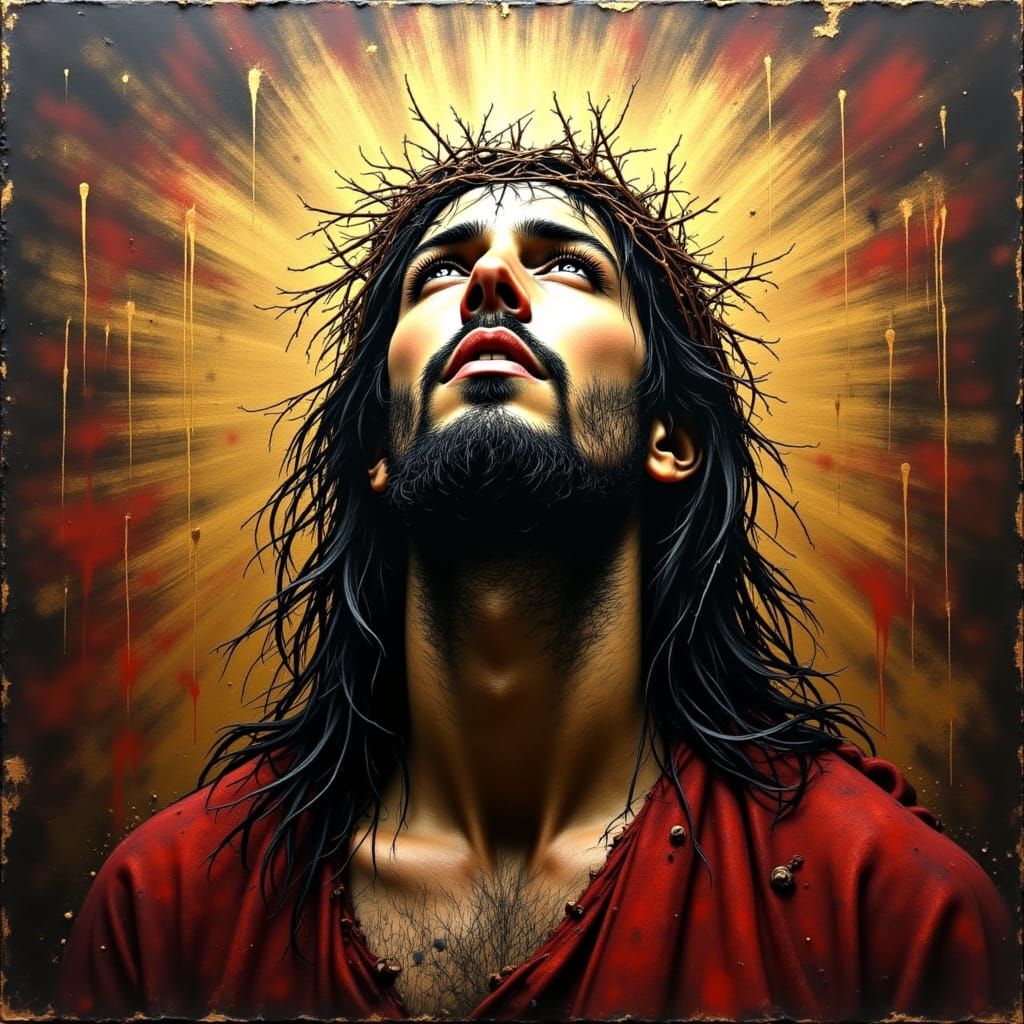 This image shows Jesus with a crown of thorns, conveying profound love. The artwork features dramatic red, gold, and brown streaks in an expressionist digital matte painting style.