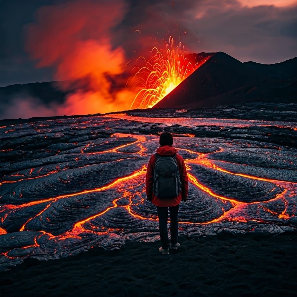 A dramatic image shows a lone hiker silhouetted against the erupting Mount Bromo volcano in Indonesia. Molten lava illuminates the desolate landscape in high contrast, as a surreal sci-fi painting.
