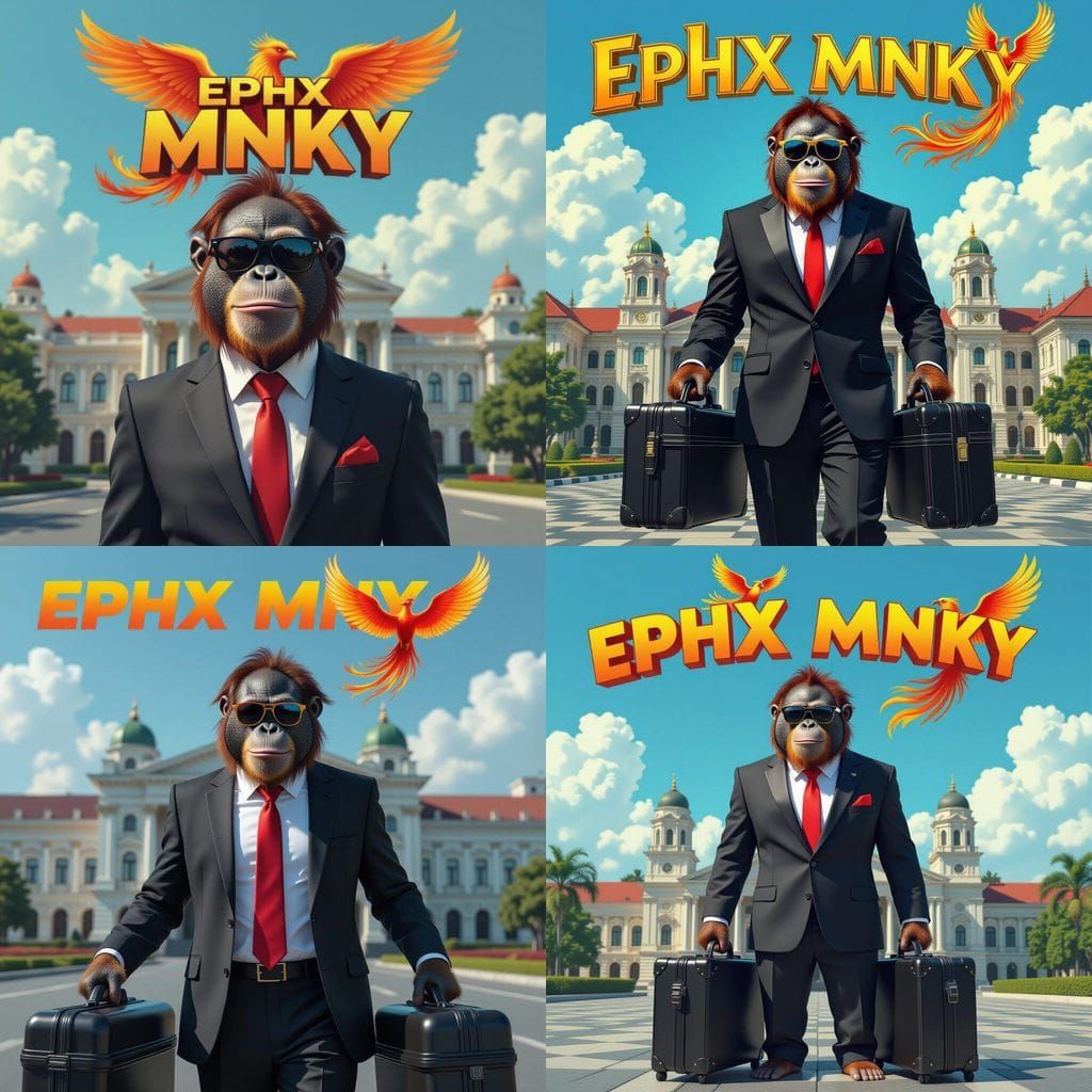 An orangutan wearing a tie and sunglasses stands before the Jakarta State Palace under a clear sky, carrying black suitcases. The scene features a phoenix animation in the sky.