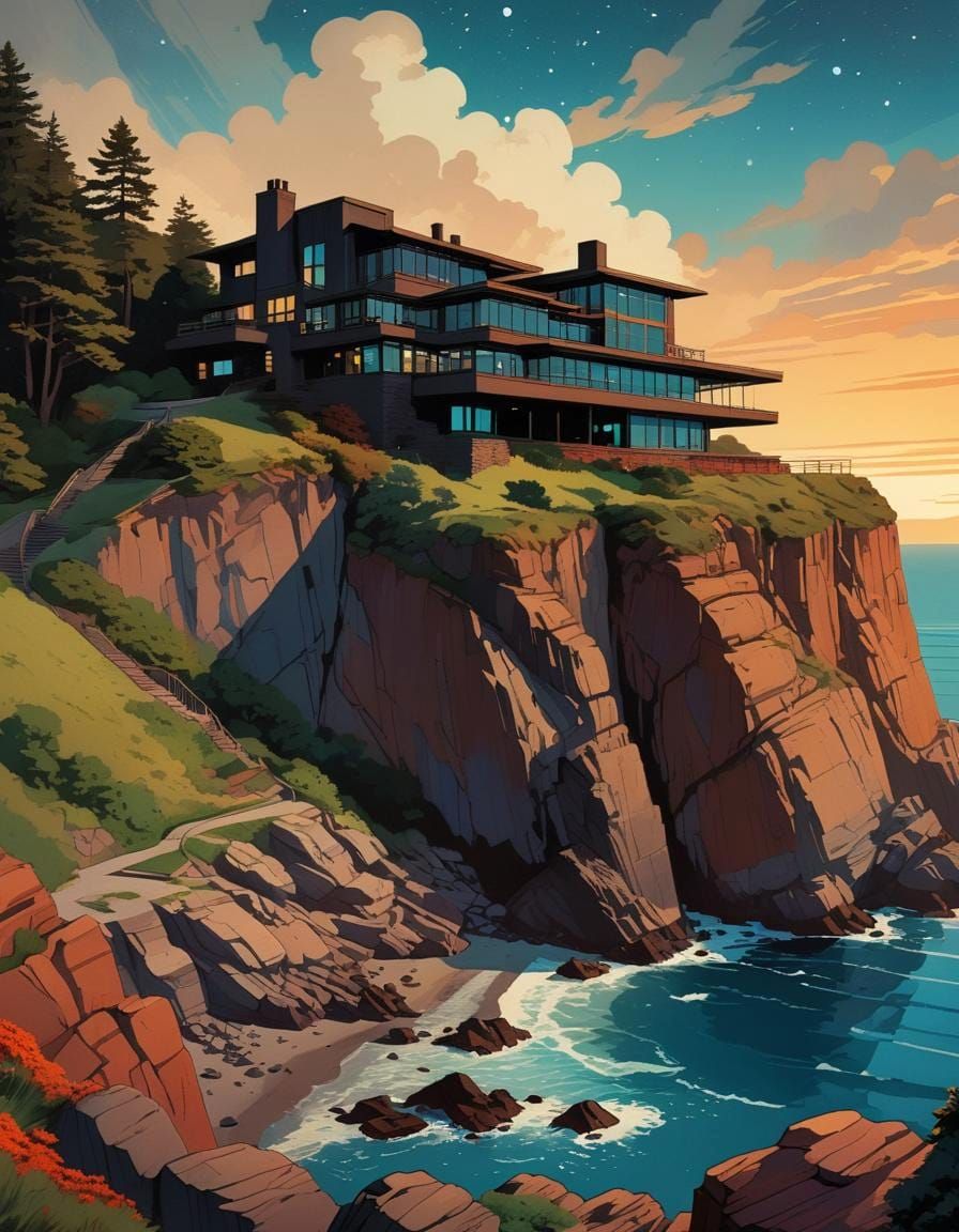 (minimalism:1.5) black scratch card technique, 70s palette, a dark figure with glowing eyes watching a Frank Lloyd Wright style cliff house built on precipice, reflective glass, sea stacks, night, starry skies, heavy shadow :: limited, clear, crisp, simple