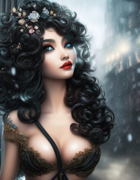 cute, petite, detailed, beautiful, smiling, skimpy bimbo with flowing intricate elaborate curly black hair, raining heavily, digita photography! detailed digital hyperrealistic art, fantastical, intricate detail, splash screen, fantasy concept art, 8k resolution, high quality blender render, Unreal ...