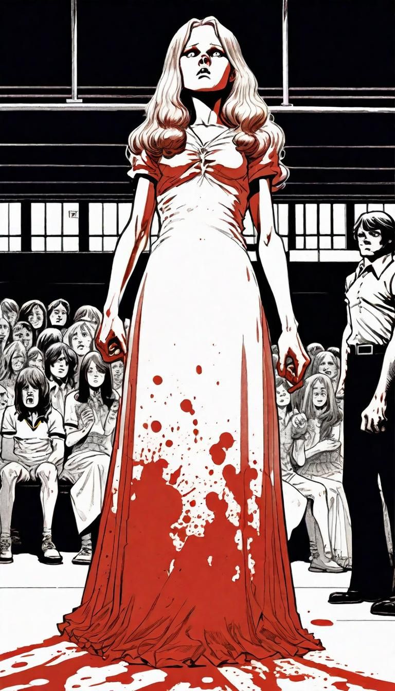 A manga-style illustration of Carrie White in a blood-soaked prom dress, wandering through a chaotic high school gym. The artwork features a detailed character design.