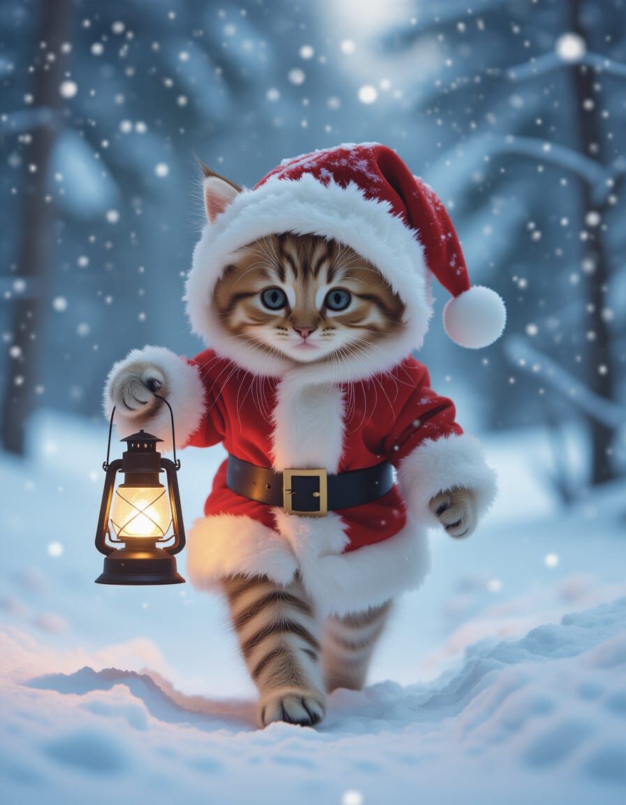 A highly detailed photo of a cute kitten in a Santa suit, walking through a snowy winter forest holding a lantern. Masterpiece fantasy concept art with intricate details.