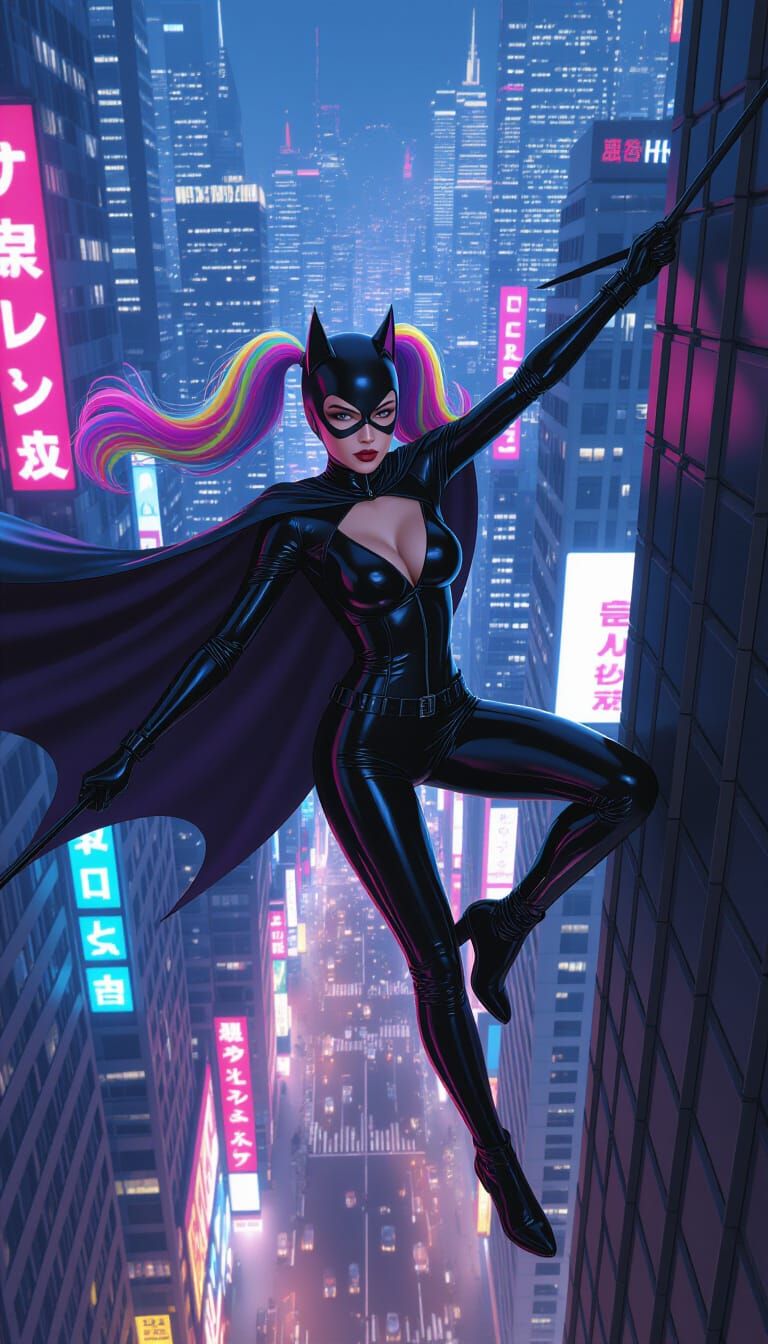A woman in a catsuit leaps from a building under neon lights. She has rainbow hair and a bat-shaped staff. The image is photorealistic with futuristic aesthetics.