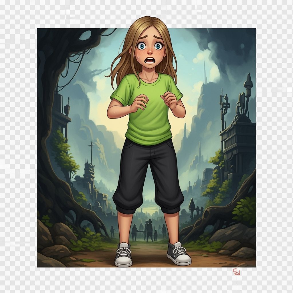 This image shows an eleven-year-old girl with a scared expression. She has light blond hair, gray-blue eyes and a summer tan, and is dressed in black breeches and a green t-shirt in a cartoon style.