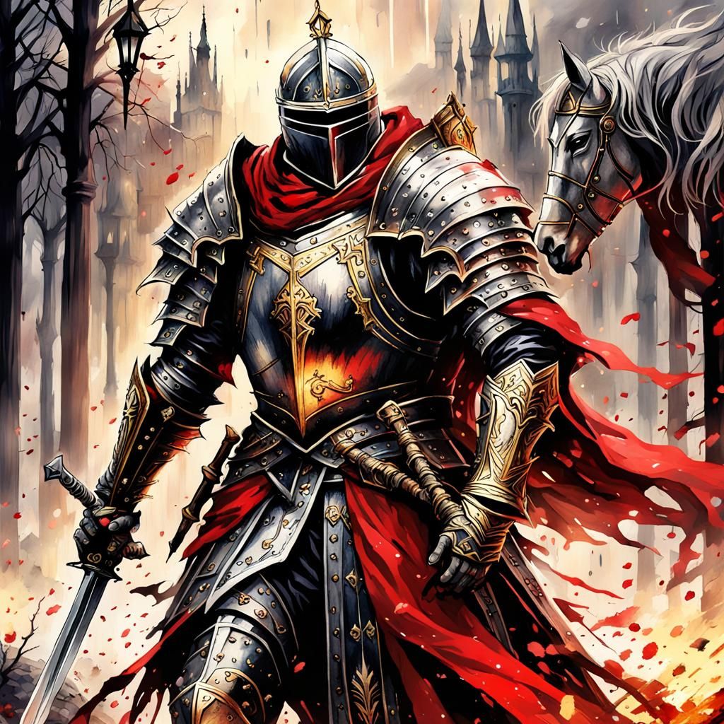This image shows a knight in ornate armor on horseback, charging into battle through a sunlit forest. The artwork features a dark fantasy aesthetic with watercolor and gouache elements.