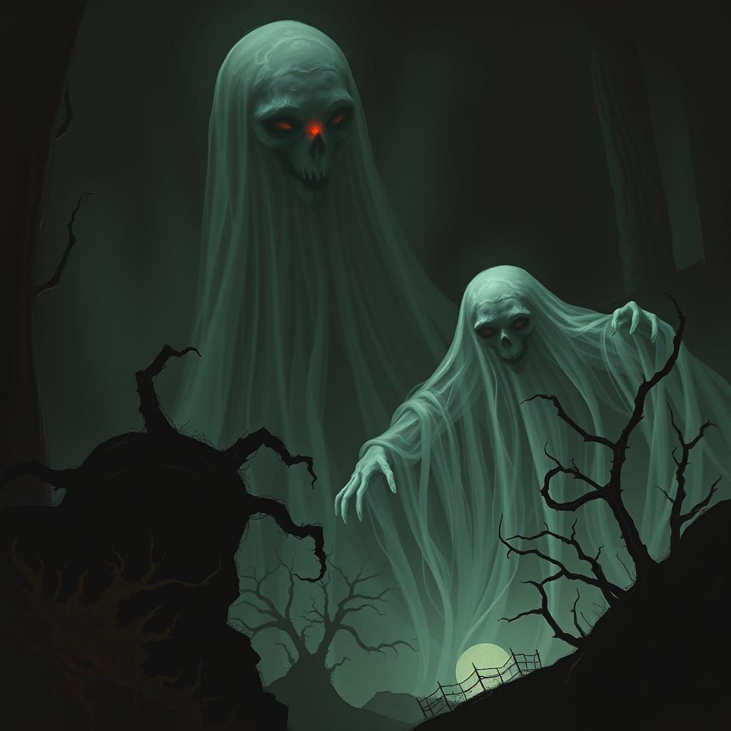 This haunting image captures the eerie essence of ghostly apparitions and eerie specters lurking in the shadows, with bold, muted colors evoking a sense of foreboding dread and supernatural presence.