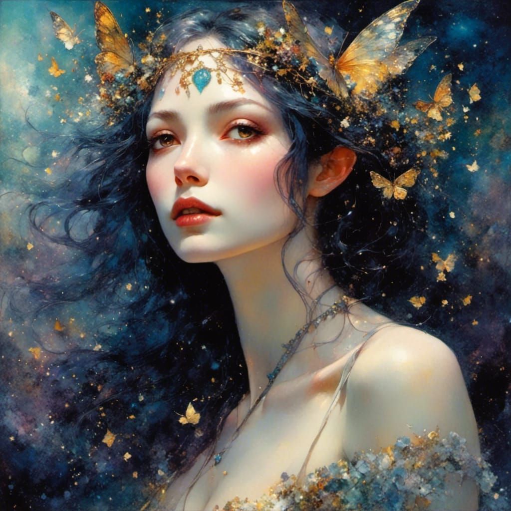 This image shows a vibrant and detailed portrait of a young, bare-chested elven princess. It is rendered with macabre dark watercolor and anime elements, in a surreal and bohemian style.