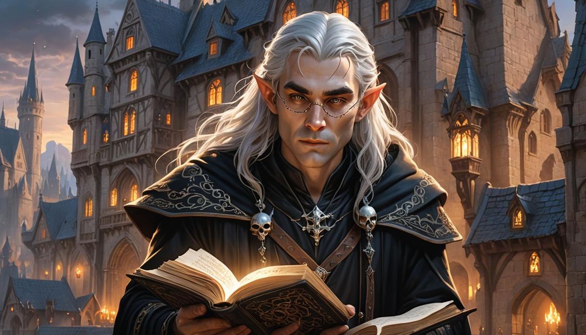 This image shows a young, silver-haired elven wizard in a black robe. Set against a medieval city at dusk, the wizard's eyes glow with mystical energy in this cinematic fantasy illustration.