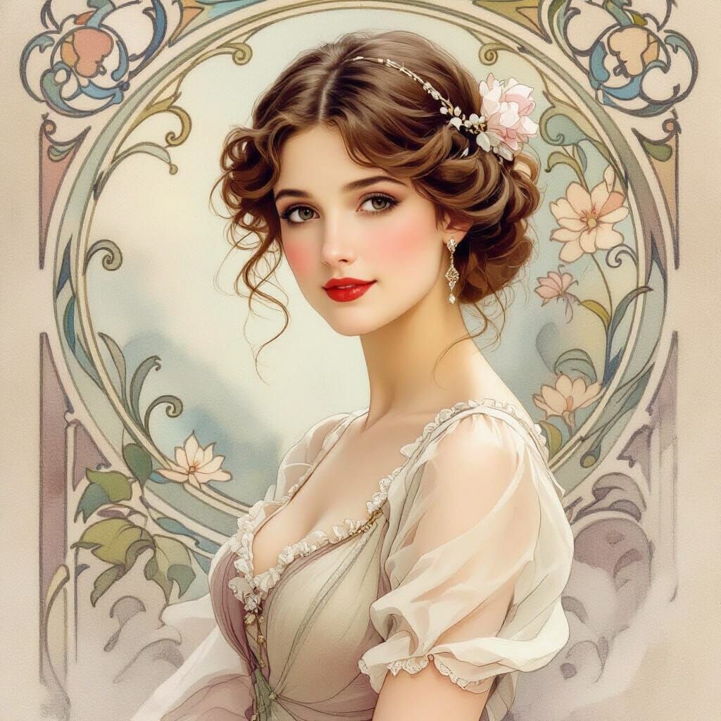 This image shows a woman in elegant clothing posing for a portrait. The artwork evokes the style of classic watercolor illustrations with soft focus and delicate brushwork.
