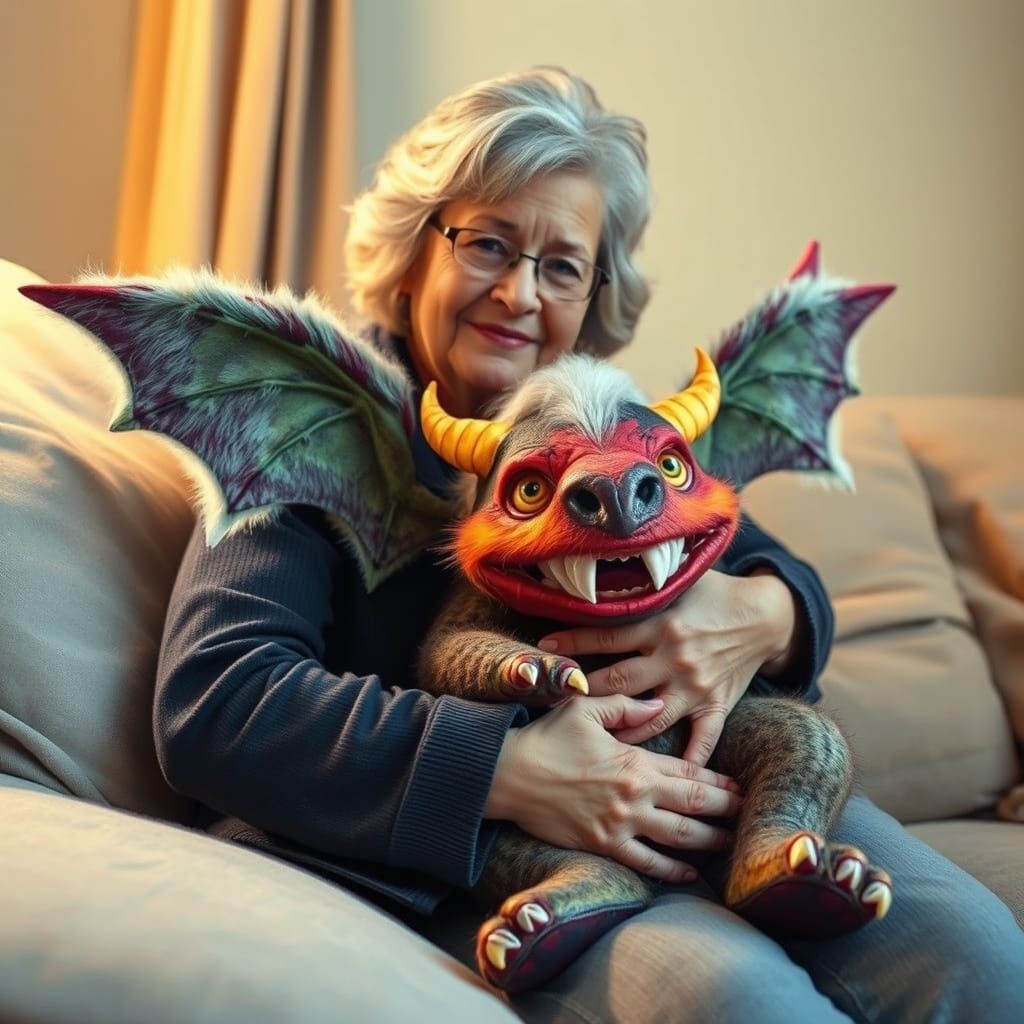 A warm and cozy scene of an old woman hugging her fantastical pet monster, with vibrant colors and soft textures, evoking a sense of storybook wonder and mythological charm.