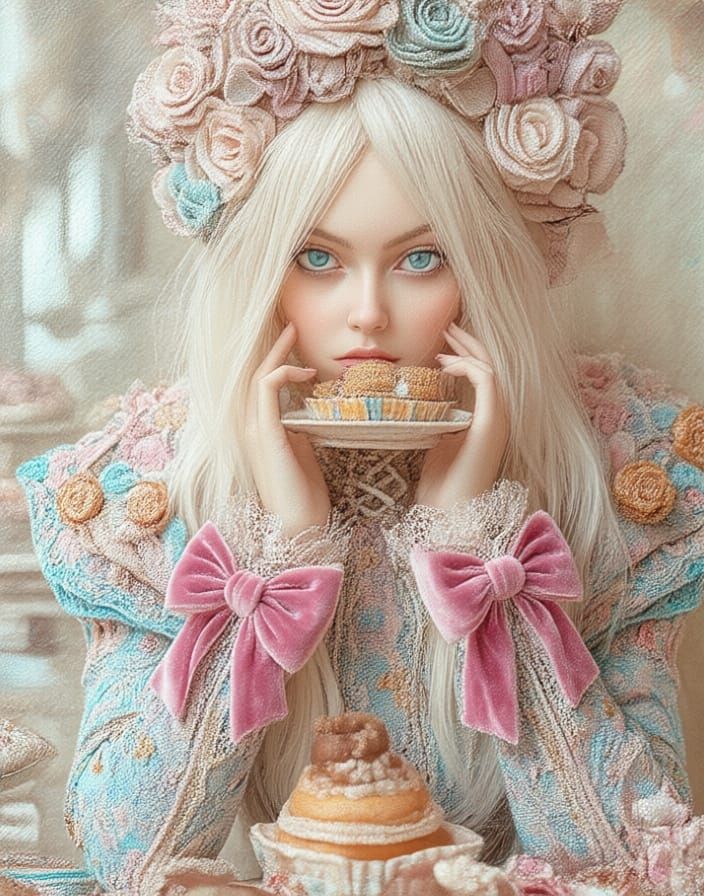 This image showcases hyper maximalist embroidery art. It features intense details with velvet, lace, ribbon, bows, and a pastel color palette.